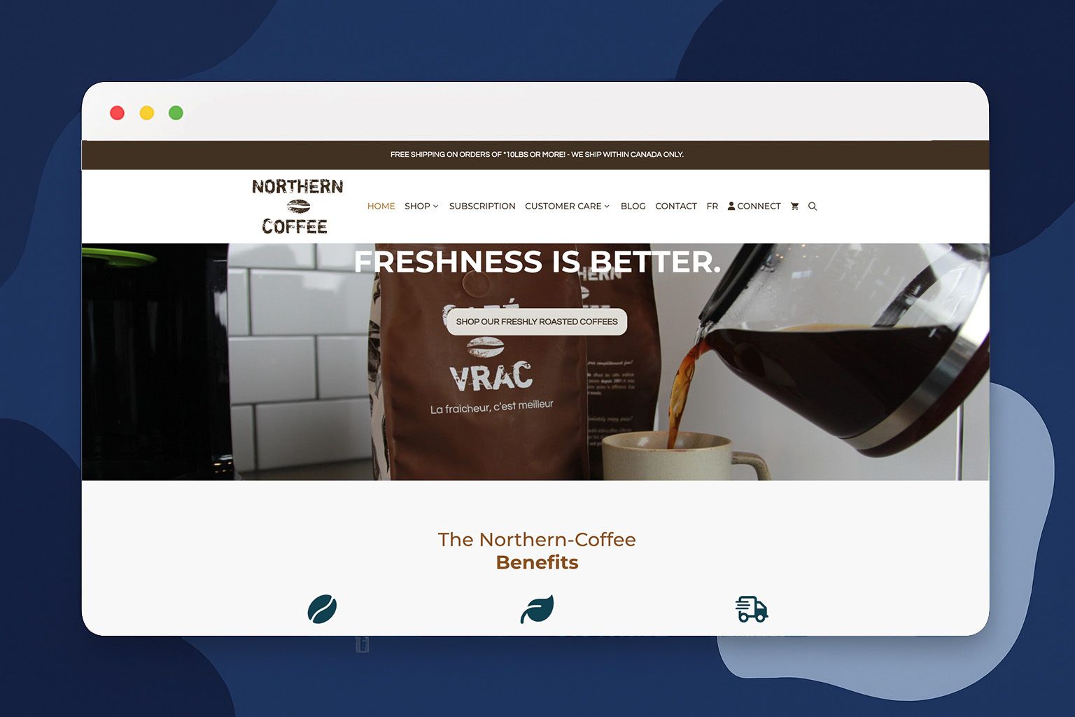 The headline "Roasted and shipped when you order" immediately addresses the number one concern for coffee lovers: freshness. The site backs this up with concrete benefits like "several formats and grinds available" and "free shipping all over Canada for orders of 10lbs and more." These aren't vague promises. They're specific answers to the questions customers are already asking themselves before they buy.